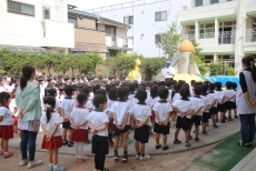 今日は、園庭で1学期の終業式があり、園長先生からは次のようなお話がありました。「今年の1学期はコロナウィルスのために短かったですね。そして、明日から待ちに待った夏休みが始まります。夏休みは、ぜひ『火・水・車・人・熱・コロナウィルス』に十分気をつけましょう。(『火』:火遊びしない、花火は大人と。『水』:プールや川・海は必ず大人と。『車』:車に注意、飛び出ししない。『人』:知らない人についていかない。『熱』:暑い日は外へ出ない、出るときは帽子着用、水分補給をして熱中症対策を。『コロナウィルス』:こまめな手洗いやうがい、消毒、マスクの着用を。)」という内容に子どもたちは集中して聞いていました。
