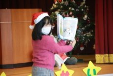 次は、副園長先生が登場し、魔法をかけると空の缶からサンタとトナカイの人形が出てきました!そのサンタの人形を大きな箱に入れると、里香サンタが出てきました。続いてトナカイの人形を箱に入れると大矢トナカイが登場!!里香サンタや大矢トナカイが登場するたびに、お母様方から「わー!」と大きな驚きと喜びの声があがりました。