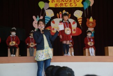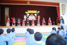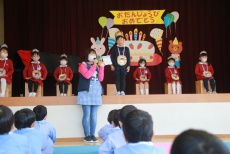 2021年12月16日(木) 12月誕生会 今日は、12月生まれのお友だちの誕生会がありました。 9人のお友だちは、舞台の上で自分の名前と年齢、大きくなったらなりたいものを発表しました。アイスクリーム屋、花屋、CA、プリキュア、サッカー選手など思い思いの夢を話していました。ただ、大勢の前のせいか、いつも笑顔で元気なお友だちも緊張気味の子が多かったです。 お家の方からの手紙は、誕生のエピソードなど心温まる内容で会場も幸せな雰囲気に包まれました。 きく(年少)・さくら(年中)の誕生会は、後日動画で配信します。楽しみにしていてくださいね。