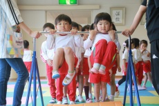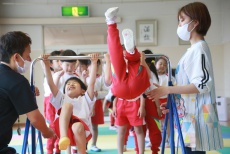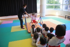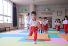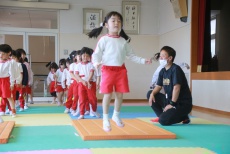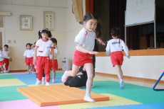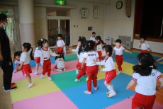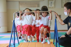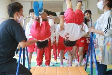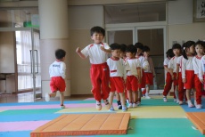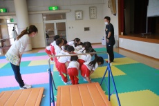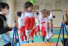 2022年04月22日(金) 体育教室開始 今日から「体育教室」が開始しました。 講師は、課外のサッカー教室の浅沼先生です。最初に先生の自己紹介があり、あいさつや返事、並び方などのルールを学びました。その後、簡単なゲームをした後、マットを使ってステップやジャンプをしました。また、鉄棒に取り組みました。鉄棒が得意なお友だちは逆上がりを上手に行い、みんなから拍手をもらい嬉しそうでした。 さくら(年中)、ききょう(年長)のお友だちは、楽しさの中にも真剣な表情で取り組んでいました。今後は、跳び箱や縄跳び、ボール運動などを行っていく予定です。