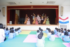 最初、パラグアイの国旗や言葉、衣装が紹介されました。パラグアイの国旗は表と裏では中央の部分が異なっていること、アルパの弦は音階が分かりやすいように色が付いていること、演奏者は暗譜で演奏するなどのお話を聞きました。