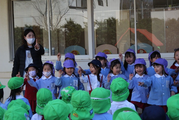 最初に園長先生から「きく・さくらさんは、ききょうさんからいろいろなことを教えてもらったり、かっこいいところを見せてもらいましたね。『ありがとう』の感謝の気持ちを伝えましょう。ききょうさんは、小学校に行くと今度は1番下の学年になりますが、西幼でがんばったという自信を持って、先生や上級生のお友だちの言うことを素直に聞いて頑張りましょう」などといったお話がありました。