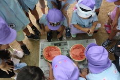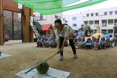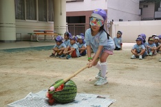 また、18日(金)はすいか割りがありました。子どもたちはやる気満々!割れなかったすいかを先生たちが見事割ることができました。割ったすいかは、給食の時に美味しくいただきました。