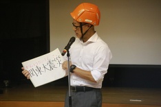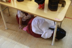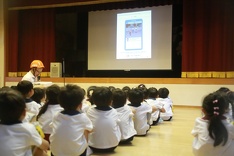 また、「防災の日」にちなみ防災避難訓練・引き渡し訓練を実施しました。緊急地震速報装置が作動すると、子どもたちは速やかに机の下に隠れました。その後は放送の指示で講堂に集合し、園長先生の話を聞きました。今からちょうど100年前に起きた「関東大震災」の話でした。その後、みんなで「ゲームで学ぶ水害・地震の避難」についてスクリーンを見ながらシミュレーションしました。地震が発生した時に、「頭を抱えて伏せる」「倒れそうなテレビを支えに行く」「外に飛び出す」の3択から選んでゲームを進めていきます。無事避難できるための設問が全部で4問あり、正解のたびに子どもたちが喜ぶ姿がありました。