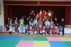 最初、副園長先生が登場し、魔法をかけると空の箱の中からサンタの人形が出てきました!そのサンタの人形を大きな赤い箱に入れると、サンタさんが出てきてお母様方から「わー!」と大きな声があがりました。子どもたちは、大きな箱の中からサンタさんが出てきて、驚いたりちょっぴりおどおどしたりしているお友だちもいました。