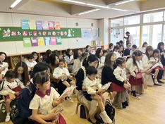 最初にさくら(年中)・ききょう(年長)は毎朝行っている日課をご覧いただきました。クラシック音楽黙想の後、「西幼よい子のお約束」の唱和、出席確認を見ていただきました。また、きく(年少)は手遊びと絵本の読み聞かせをご覧いただきました。