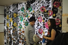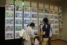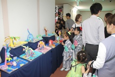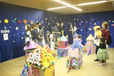 日頃の保育や絵画教室の時に作ったさまざまな作品が展示されました。今年の共同製作のテーマは、「うちゅうへ ゴー!」です。なかよし交流タイムで作成した各グループのロケットや宇宙人、惑星などが展示されました。