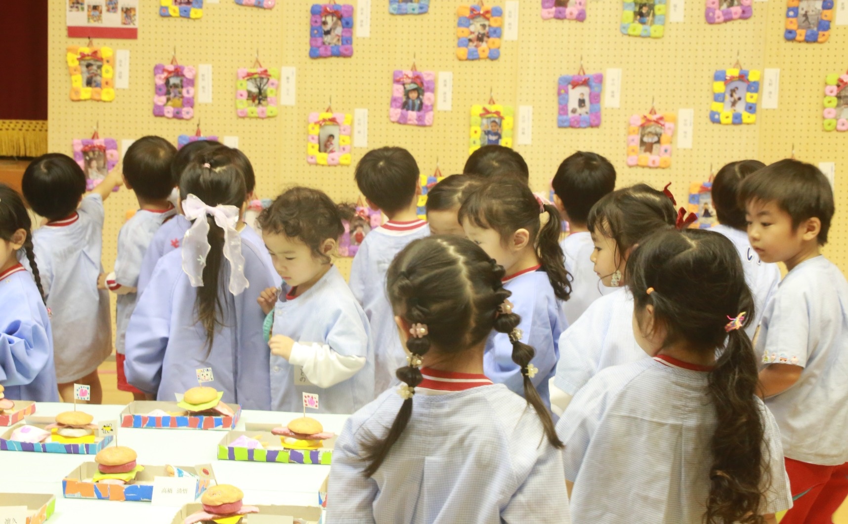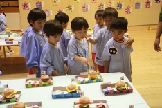 さくらの紙粘土作品のハンバーガーセットを見て「本物みたいでおいしそう!」「お腹が減ったから食べたくなった」と言うお友だちの声も。それを聞いた先生が、「みんなでいただきますをしましょう」と言ってみんなで食べる姿がとても微笑ましかったです。