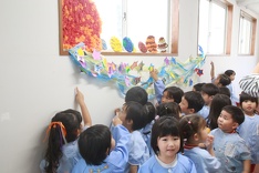 「見て!これは僕のお魚(絵)だよ」とアピールするお友だち、ききょう(年長)組の名古屋城の作品を見て「すごいね」と言って感心するきく(年少)・さくら(年中)のお友だちなどさまざまでした。
