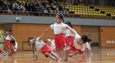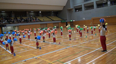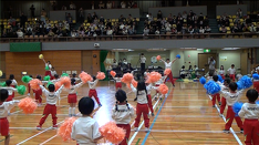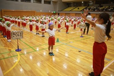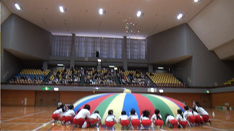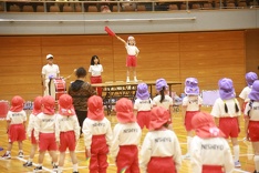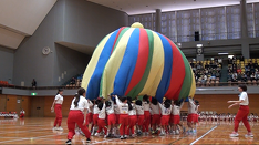さくら(年中)組の遊戯は、パラバルーン『最高到達点』でした。曲に合わせてパラバルーンがメリーゴーランドや朝顔、ロケットなどさまざまな形になりました。そして、クライマックスではバルーンの中からたくさんのカラーボールが最高到達点まで上がると、会場からは「おー!!」の歓声が上がりました。