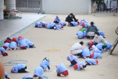 「緊急地震速報装置」が作動すると園庭で遊んでいた子どもたちは、素早くダンゴムシの体勢をとり、教室にいた子どもたちはすぐさま机の下に隠れダンゴムシになりました。その後、ロケットタワー前に集合して人員点呼しました。