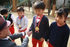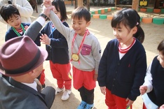 各学年、男女別で一番長く跳ぶことができた園児3名ずつが表彰されました。表彰されたお友だちは、金・銀・銅メダルを胸に満面のピカピカ笑顔で誇らしげでした。