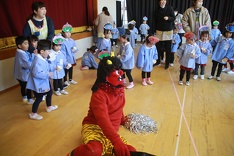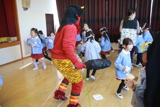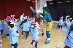 「鬼は外♪、福は内♪」と子どもたちは、元気よく歌って鬼を迎える準備をしましたが、怖い音楽とともに赤鬼・青鬼が登場すると、怖くて大泣きしてしまったお友だち、先生にくっついて離れようとしないお友だち、鬼に対して威勢良く豆を投げつけるお友だちと様々でした。