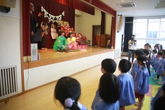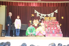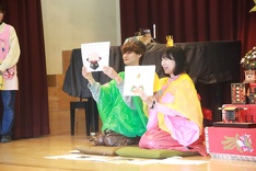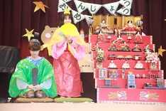 講堂の幕が開くと、舞台の上には七段飾りのひな人形の隣に大空先生と副園長先生そっくりさんのお内裏様が、すまし顔で座っていました。二人の登場に園児たちは、「大空先生だー!」などと言って喜んでいました。そして、園長先生とせいな先生が親子として登場して寸劇が始まりました。