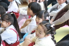 続いてお内裏様からの2択クイズがありました。ひなまつりに関する花は桃か梅か、ひなまつりに関するお餅は鏡餅か菱餅か、ひなまつりに関する食べ物はちらし寿司か恵方巻きかといった問題に子どもたちは元気よく手を挙げ、正解だったお友だちは大喜び!