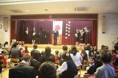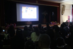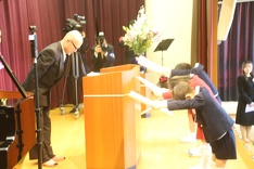 式後は、廊下でお家の方に感謝の言葉と共に修了証書を渡したり、講堂で記念写真を撮影したりしました。また、恒例となっている担任からの卒園児一人ひとりへのメッセージスライドの上映と、『西幼で学んだこと がんばったこと』の上映がありました。卒園児や保護者の皆さんは、楽しかった幼稚園生活を振り返りながら、なつかしそうにご覧になっていらっしゃいました。そして、その後の謝恩会では、保護者の皆様から教職員への謝辞ならびに手作りフラワーソックスなどの贈呈がありました。