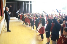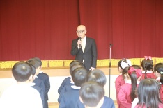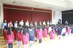最初にみんなで園歌を歌いました。園長先生は、「今日から令和8年度が始まりました。日曜日に37人のお友だちが西幼稚園に入園して全部で131人が西幼稚園のお友だちになります。今の新鮮な気持ちを忘れずに、この一年間こつこつと頑張りましょう。」といったお話の後、みんなで「がんばるぞ!おー」をしました。