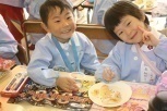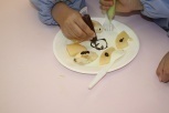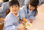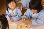 2011年11月17日(木) かんたんクッキング 今日は、「なかよし交流タイム(異年齢保育)」でかんたんクッキングに挑戦しました。 バナナや桃、パインのフルーツにチョコペンやチョコスプレーでデコレーション。とっても美味しそうなフルーツデザートが出来上がりました。ご褒美として給食(チャーハン、揚げシュウマイ)の後に食べました。年長のお友だちが年下のお友だちの分まで作ってあげる姿は微笑ましかったです。 また、なかよし交流のクラスごとにSLに乗り、園児たちの元気な歓声が園庭に響いていました。