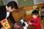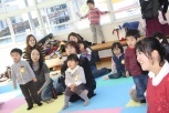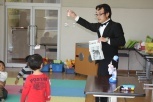 ちぎったティッシュを丸めるとレインボー色の紐に変わったり、みんなのかけ声で紐がピンピンに固くなったり。また、園長先生がミッキーと電話して、ミッキーのマジックをいくつか見ました。最後は、お母様に引いてもらったトランプをズバリ当てたり、さらにはそのカードがペットボトルのジュースの中に入っていたり、みんなはビックリ!そして不思議?な表情に。