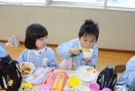 第2部は、お楽しみのランチブッフェです。なかよし交流タイム(異年齢)のクラスごとに分かれて、エビフライ、巻き寿司、たこ焼き、唐揚げ、ラーメン、フルーツなどから好きな物を食べました。食後のデザートは、なんと美味しそうなエクレア!!