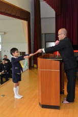 卒園証書授与では、名前を呼ばれた卒園児たちが、元気にかっこよく返事をして、誇らしげに堂々とした態度で証書を受け取りました。その証書を卒園児から感謝の言葉を添えて手渡された保護者の方々は、目頭を押さえ涙ぐんでいらっしゃいました。