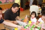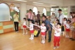 2010年06月06日(日) 家族参観日 今日は家族参観日。朝のお並びでは、朝のあいさつやディズニー体操を元気いっぱいできました。そして、6月10日の「時の記念日」にちなんで親子並んで「とけいのうた」を振り付けしながら踊りました。 その後、各教室でプレゼント渡しをしたり、製作したりしました。きく組は「とんとん相撲」、さくら組は「パラシュート」、ききょう組は「的当て」を作り、作った物で早速お家の方と遊びました。お家の方にも笑顔が見られ、すてきな「時間」を過ごすことができましたね