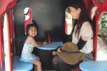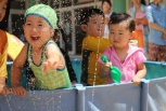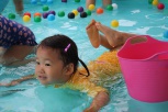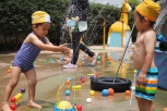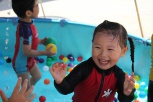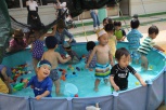 2014年07月02日(水) たんぽぽ水遊び 7月1日・2日はたんぽぽ教室のお友だちの水遊びでした。 お部屋でごあいさつと動物体操をした後、裸ん坊になってプールにドボン。 2日間とも、真夏を思わせるお日様の下、お友だちはプールで大喜び。先生にシャワーの水をかけられても泣かずに嬉しそう。おもちゃやボールを水に浮かべてニコニコ笑顔。そんなお子様の様子をお母様たちもニコニコ笑顔でした。