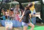 さくら(年中)組のお友だちやききょう(年長)組のお友だちは、動きも活発で大いに盛り上がりました。担任の先生や園長先生も子どもたちに水をかけられて全身びしょ濡れに!担任の先生も園長先生も童心にかえっていっしょに水遊びに興じていました。
