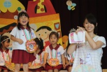 14人のお友だちは、自分の名前と大きくなったらなりたいものを発表し、みんなから祝福されました。いつもは元気なお友だちも大勢の前ではちょっぴり緊張気味。「水鉄砲」の歌と言葉のプレゼントに舞台のお友だちも嬉しそう。そんな様子をお家の方々も、にこにこしながらビデオカメラで撮影していました。