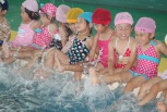 7月夏期保育の午前は、城西スイミングスクールのインストラクター指導によるスイミング教室。きく(年少)組の園児たちは、初めて見る大きなプールに少し驚いていた子もいましたが、少しずつ慣れて元気よく参加できるようになってきました。