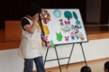 先生からのプレゼントは、「かくれんぼ」のパネルシアターでした。カミナリ様、かに、キリギリス、かめ、チョウチョなどのお友だちがどこにかくれたかをみんなで探しました。木の陰や草むら、ゴミ箱、雲など、上手にかくれたつもりでも西幼のお友だちにみ~んな見つかってしまいました!