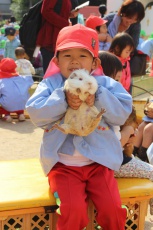 また、にわとりを頭に乗せたり、モルモットを抱いたり。特に、うさぎの「いちごちゃん」との楽しい会話と歌には、園児たちも保護者の方もいつものように大爆笑!!