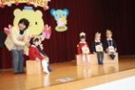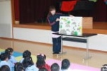 「ずっと卵のままでいい。」というたまごにいちゃん、卵の殻を割らないように気をつけていたけど、ある日カラスに割られそうになって逃げているうちに石にぶつかってひびが入ってしまいました。そしたら、意外と自分の姿がかっこいいことに気づいたたまごにいちゃん、というお話。園児たちは、ずっと絵本の世界に引き込まれて静かに見ていました。