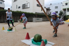 最終日には恒例のすいか割りが行われました。「前、右、左、後ろ」のみんなの指示で動き、「せーの」の合図で思い切り棒を振り下ろしました。お友だちの中には、すいかに当たりパカッと見事きれいに割れました。割ったすいかは、なかよし交流タイム(異年齢保育)の時に美味しくいただきました。
