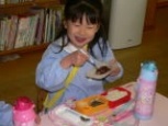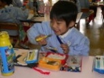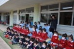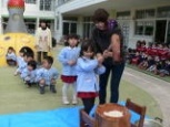 2010年12月09日(木) もちつき会 今日は「もちつき会」でした。 ききょう(年長)組やさくら(年中)組のお友だちは、きく(年少)組のお友だちの、「よいしょ、よいしょ」というかけ声のパワーをもらって杵を持って力いっぱいつきました。 最後は前園長の安藤先生や園長先生・副園長先生も参加して、園庭に大きな声が響き、盛り上がりました。 みんなの力でついたふわふわのお餅は、きな粉とあんこをつけて給食のときに食べました。美味しかったね。