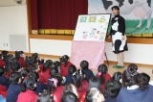 最初は、いつも元気なハルちゃんと、逆に元気のないギュー平くんのパネルシアターを見ました。元気のないギュー平くんは、ミルクの国から来たいつも元気なハルちゃんにその理由をたずねます。ハルちゃんとギュー平くんは、ハルちゃんのおばあちゃん家に行き、おばあちゃんから、「元気になれる合言葉『はやね・はやおき・あさごはん』」を聞きます。でも、どんな朝ご飯を食べたらいいのかな?ポテトチップス?ケーキ?チョコレート?・・・。