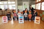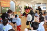 「鬼は外!福は内!!」園児たちの元気な声と豆の攻撃で、最後は赤鬼や青鬼も「参った,参った~。と降参。