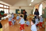 節分会(豆まき)をしました。園児たちは、豆まきの歌を踊りながら歌った後、赤鬼と青鬼が登場!