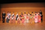 幼稚園最後の発表会になるききょう(年長)組の男子は、袴姿で扇子を持って勇ましく「男道」を踊り、側転が見事に決まるたびに会場から拍手が起こりました。女子は艶やかな着物姿で「さくら」を優雅に踊り、会場が華やかな雰囲気に包まれました。
