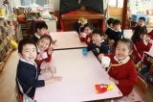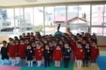 「3人の女の人たちは?」「5人いる男の人のことを何と言うの?」という質問に、舞台のおひな様たちはていねいに答えてくれました。最後に「おひな様とお内裏様は、どうして扇や杓を持っているの?」という質問に「悪い病気や不幸なことを吹き飛ばすためだよ。」よいう答えに、園児たちも「へ~。」と、うなずいていました。