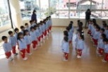 はじめにお互いに言葉と歌のプレゼントをしました。ききょう組のお友だちは、「ドキ ドキ ドン!一年生」を、きく・さくら組のお友だちは「みんなともだち」を大きな声で歌いました。ゲーム「じゃんけん列車」では、どんどん列車が長くなって、最後は一つの大きな輪になりました。