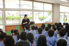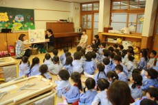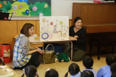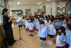 講師は、園児たちから人気ある神谷 舞先生です。特にきく(年少)組のお友だちは、歌唱指導が初めてのためか神谷先生の美しい歌声に不思議な表情、驚いた表情で聴いていました。そして、「おはようクレヨン」のパネルシアターでは、神谷先生の歌声にどの子もNHK「みんなのうた」の世界に引き寄せられてパネルに釘付けになっていました。
